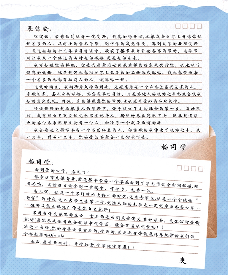 一位名叫葉珺的女生,看到江西勵志女孩佳琦的報道后,給這位千里之外素未謀面的“妹妹”寫了一封信,“我本來不輕易跟別人說自己的經(jīng)歷,但是看到佳琦的情況后特別感同身受,我覺得將自己的心聲傳達(dá)給這個小妹妹很有意義?!?/p>