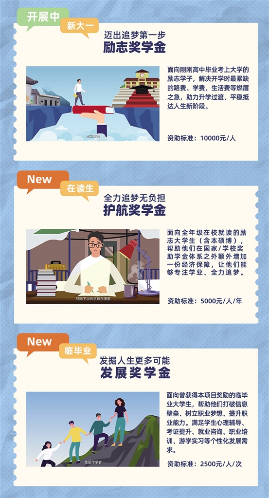 今年高考分?jǐn)?shù)揭曉在即,項目升級為“夢想+”大學(xué)生助力計劃,除繼續(xù)重點獎勵剛考上大學(xué)的勵志新生每人1萬元“勵志獎學(xué)金”外,之后學(xué)生在本碩博直到臨畢業(yè)期間,如有困難仍可繼續(xù)申請“護(hù)航獎學(xué)金”(5000元/人/年)和“發(fā)展獎學(xué)金”(2500元/人/次)。為了能夠讓更多學(xué)子獲得獎學(xué)金,今年項目繼續(xù)聯(lián)合杭州嘉互助學(xué)基金會開通公募渠道,公募款將100%用于獎勵勵志學(xué)子。