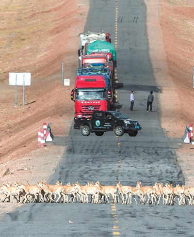 在青藏線上,順利遷徙的藏羚羊群,展現(xiàn)著人與自然和諧共生的生動(dòng)畫面。