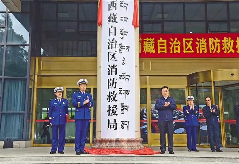 6月18日上午,自治區(qū)黨委書記王君正前往自治區(qū)消防救援總隊(duì)調(diào)研。這是王君正為西藏自治區(qū)消防救援局揭牌。本報(bào)記者 旦增西旦 攝