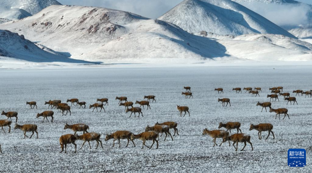 這是在甜水河畔荒灘雪地中向產(chǎn)羔地遷徙的藏羚羊(6月15日攝 無(wú)人機(jī)照片)。新華社記者 晉美多吉 攝