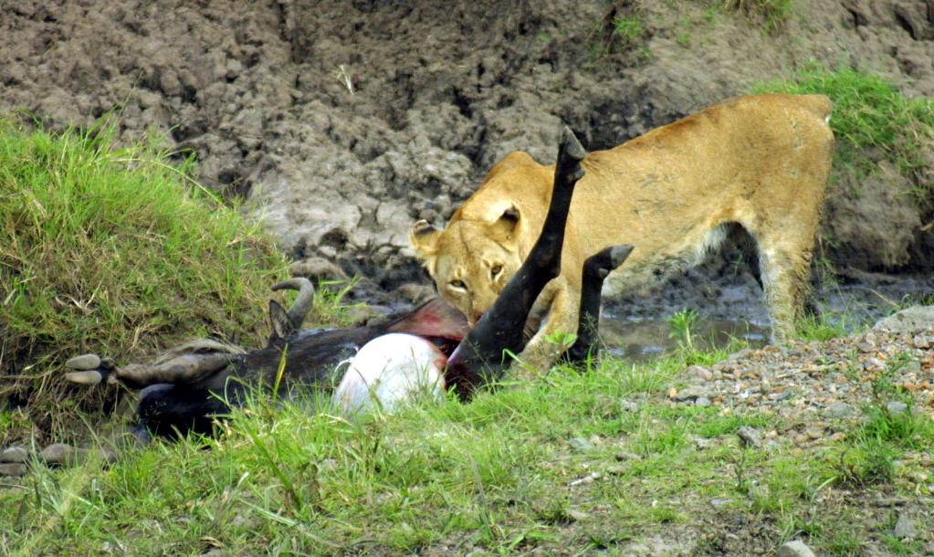 ↑ 在馬賽馬拉國家保護區(qū),一頭獅子正在享用自己的獵物。