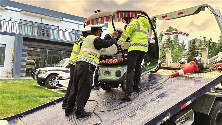 6月19日18時許,記者來到拉薩市城關(guān)區(qū)江蘇東路與嘎瑪貢桑路交叉口,此時正值下班高峰期,各類車輛川流不息,十分繁忙,拉薩市公安局交警支隊城南大隊的民警們一邊疏導交通,一邊開展電動三輪、四輪車專項整治行動。沒過多久,一輛電動三輪車準備通過路口,民警丹增發(fā)現(xiàn)該車輛存在非法改裝現(xiàn)象,便立即上前將車輛引導至安全位置,檢查后發(fā)現(xiàn)駕駛?cè)怂阶詾檐囕v加裝遮陽篷,上路行駛存在較大安全隱患,便按照相關(guān)法律法規(guī)暫扣車輛。丹增告訴記者:“我們會將暫扣的車輛統(tǒng)一停放,等駕駛?cè)私邮芴幜P并提交相關(guān)資料后,才能領(lǐng)回車輛?!?/p>