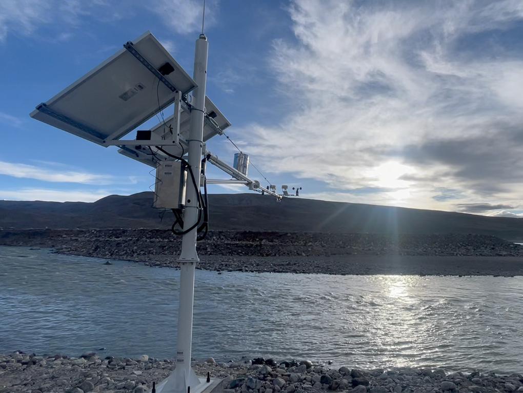 考察團(tuán)隊在措嘉冰川安裝的新設(shè)備,以檢測冰川融水的水位和所在地區(qū)的氣象條件(6月23日攝)。新華社記者 邱星翔 攝
