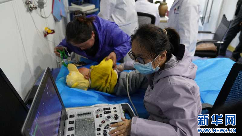 “心佑工程”團隊成員正在對疑似先天性心臟病患兒進行心超檢查(新華社發(fā))