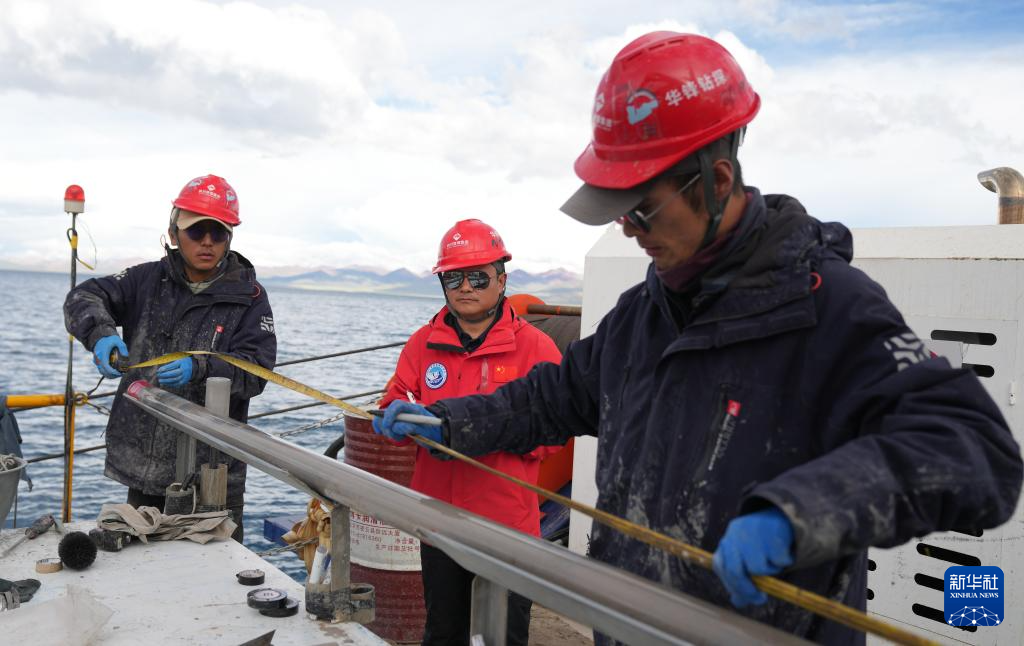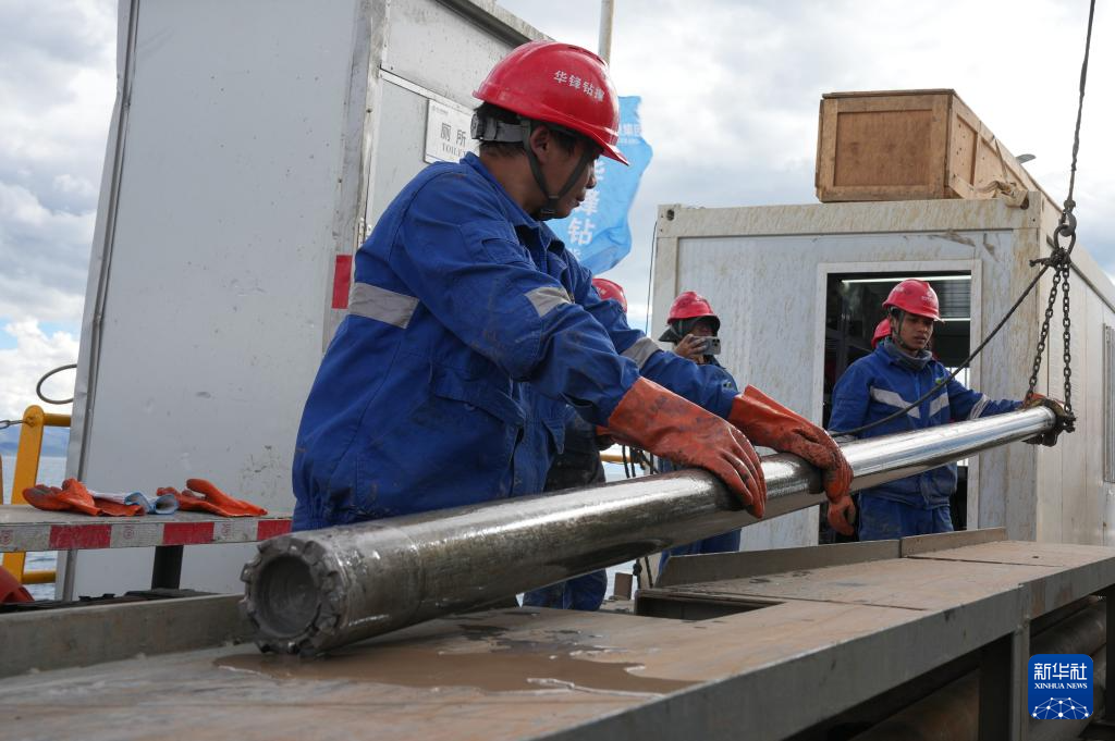 7月12日,鉆探隊(duì)員提取納木錯湖底402.2米深度湖泊巖芯樣品。新華社記者 晉美多吉 攝