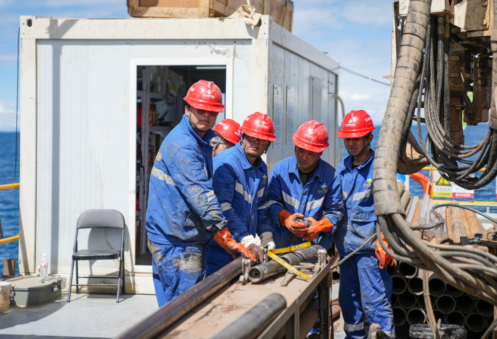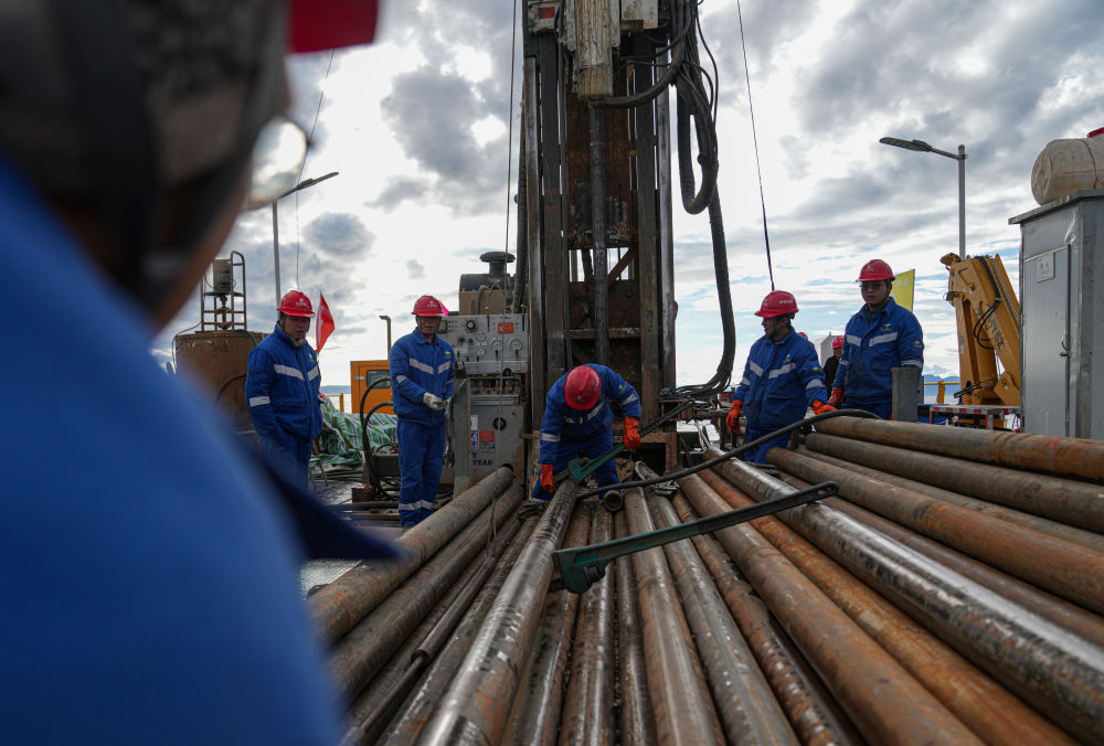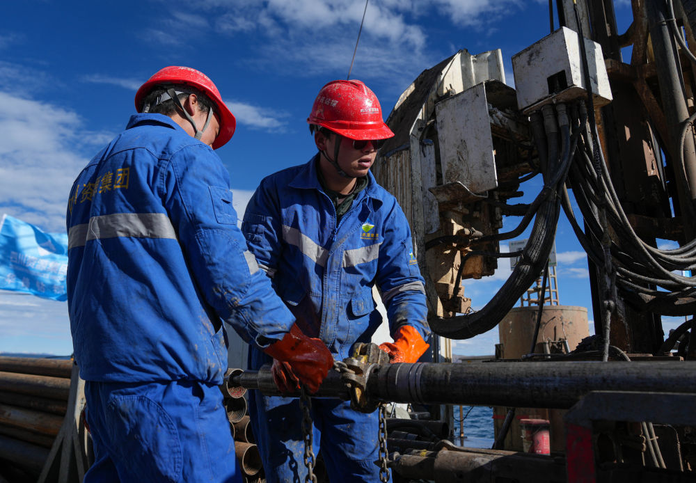 7月11日,鉆探隊隊員在準備增加孔內鉆桿。新華社記者 晉美多吉 攝