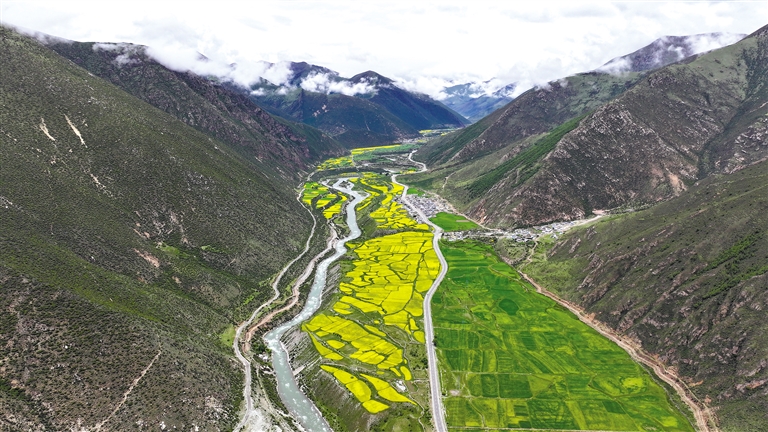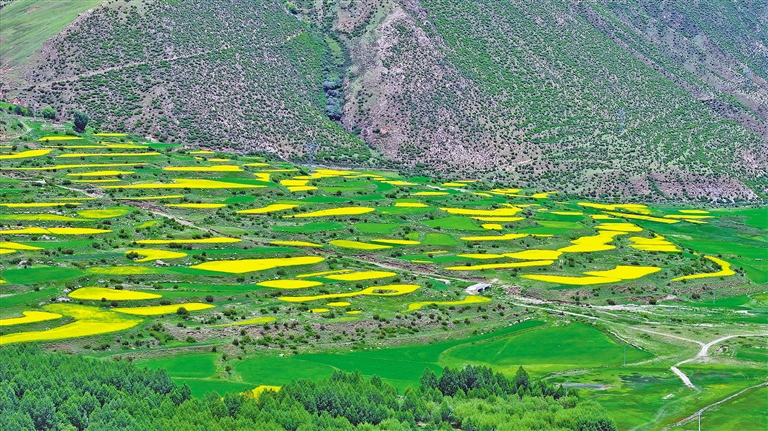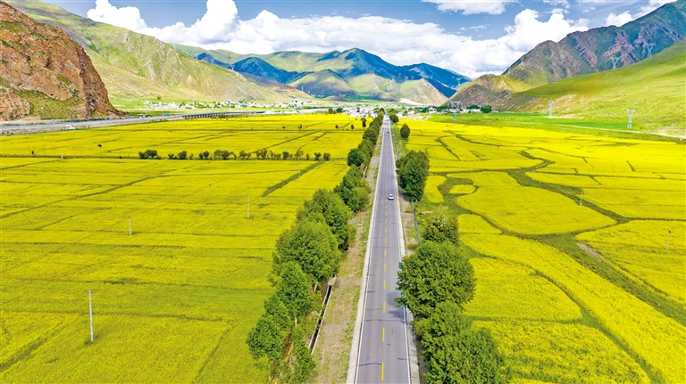 最近,墨竹工卡縣迎來了油菜花的盛開時節(jié)。放眼望去,滿目的油菜花如同金黃色的毯子般鋪展開來,在微風中搖曳,散發(fā)出迷人的香氣。一團團、一簇簇的金黃色花朵點綴在田野上,流動著濃濃夏意。成片的花海與蜿蜒的農(nóng)村公路、錯落有致的村居共同構成了一幅和諧美麗的田園風景圖。