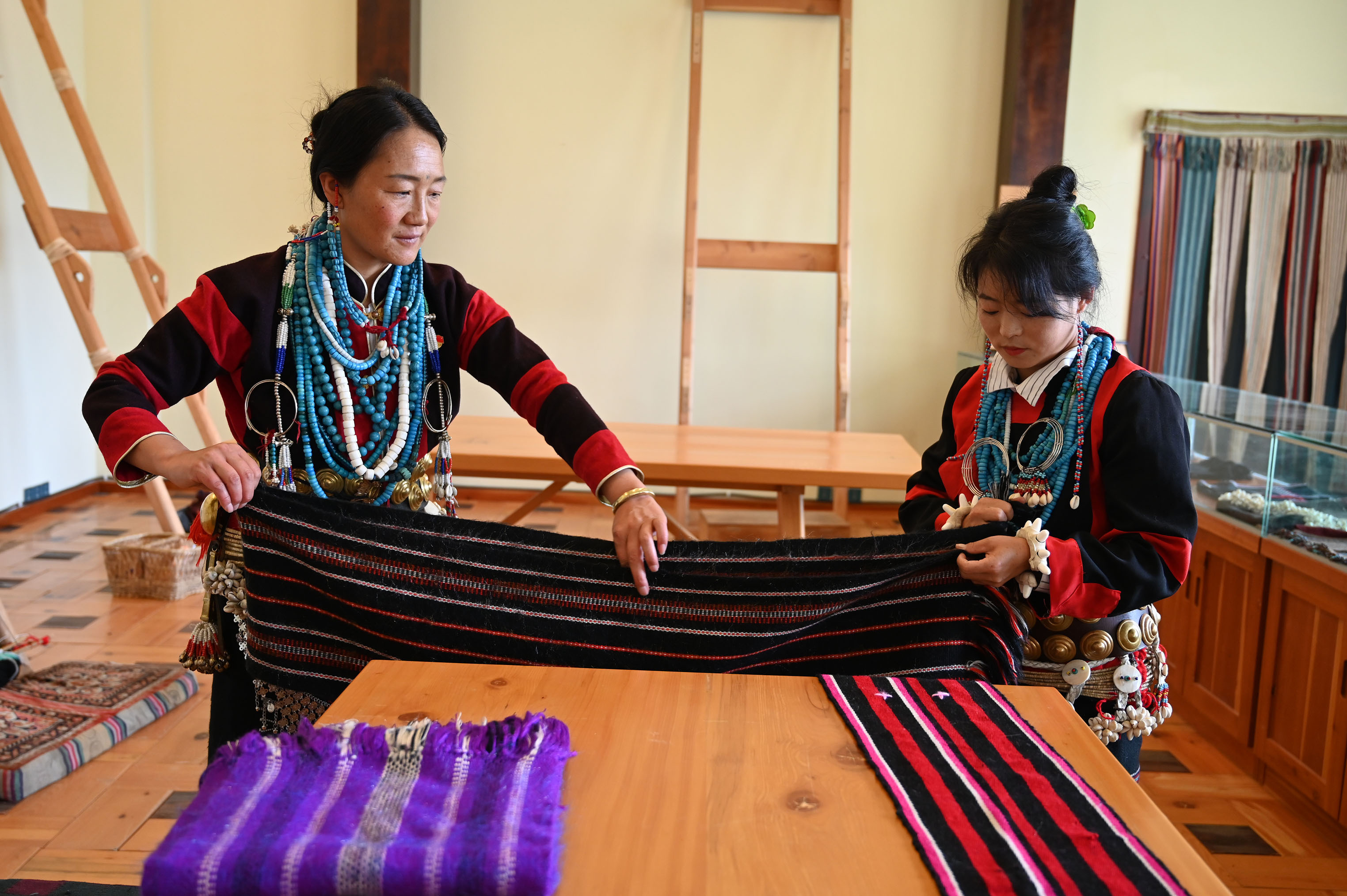 41歲的亞達兒不僅是才召村的婦聯(lián)主席,也是村里有名的黨員致富帶頭人。2007年,亞達兒開始向珞巴織布非遺傳承人亞依學(xué)習(xí)織布技藝。2014年,在相關(guān)部門的扶持下,米林珞巴族織布服飾加工傳習(xí)所在才召村成立,并聘請珞巴手工藝人亞依擔(dān)任教師,組織村里的年輕婦女進行系統(tǒng)學(xué)習(xí)。