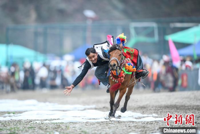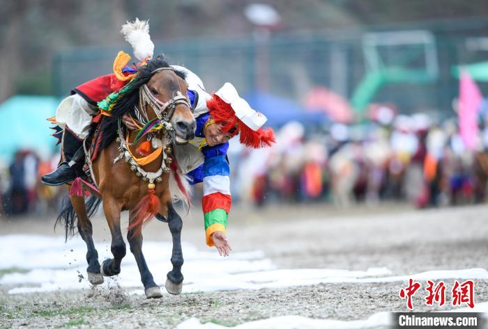 7月21日,西藏自治區(qū)拉薩市堆龍德慶區(qū)馬鎮(zhèn)朗巴村民眾賽馬歡度“望果節(jié)”。“望果節(jié)”民俗已有1500多年的歷史,是國(guó)家級(jí)非物質(zhì)文化遺產(chǎn)。圖為騎手進(jìn)行馬術(shù)表演。中新社記者 貢嘎來松 攝