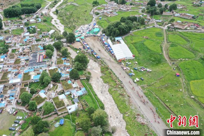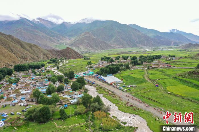 7月21日,西藏自治區(qū)拉薩市堆龍德慶區(qū)馬鎮(zhèn)朗巴村民眾賽馬歡度“望果節(jié)”。“望果節(jié)”民俗已有1500多年的歷史,是國(guó)家級(jí)非物質(zhì)文化遺產(chǎn)。圖為賽馬比賽現(xiàn)場(chǎng)。(無人機(jī)照片)中新社記者 貢嘎來松 攝