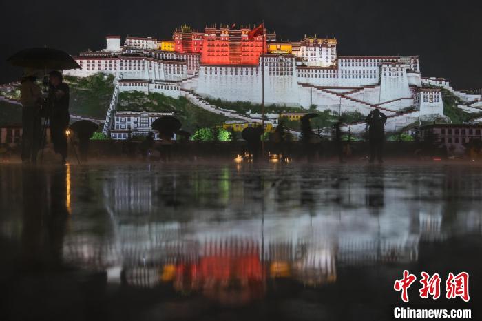 西藏布達(dá)拉宮是世界文化遺產(chǎn),入夏后,布達(dá)拉宮廣場(chǎng)音樂(lè)噴泉每晚準(zhǔn)時(shí)響起,景觀燈準(zhǔn)時(shí)照亮,宜人夜色吸引市民、游客前來(lái)觀景。圖為7月24日晚,拉薩迎來(lái)降雨,游客、攝影師等在廣場(chǎng)駐足,拍攝雨中的布達(dá)拉宮。中新社記者 江飛波 攝