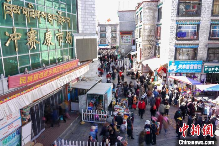 資料圖為拉薩沖賽康市場周邊人流、商戶云集,該市場是西藏最大的傳統(tǒng)百貨市場之一。