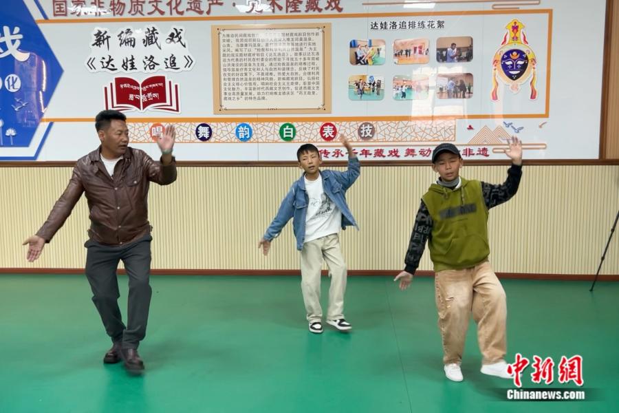 洛桑扎西現(xiàn)場指導(dǎo)藏戲小學(xué)員洛桑(右一)。 中新網(wǎng)記者 陳文韜 攝