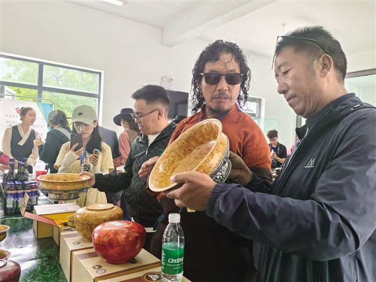 探訪團一行前往西藏山南加查達布傳統(tǒng)文化產(chǎn)業(yè)發(fā)展有限公司探訪加查木碗的制作技藝。在該公司的展廳內(nèi),西藏自治區(qū)級加查木碗非遺傳承人、公司負責(zé)人桑珠向探訪團詳細講解了加查木碗從選材、切割、打磨到雕刻的每一個制作環(huán)節(jié)。桑珠拿起一個個造型各異、原材料不同的木碗向探訪團介紹著木碗的品質(zhì)分辨技巧、用處等。楊樹、松樹、柏樹……一塊塊承載著歲月的木頭,經(jīng)過木匠們的一道道復(fù)雜的工序后,變成了精美的藝術(shù)品?!斑@種碗面像圓珠筆點涂的是上等木料制成的精品,最低售賣價值可達到4000元一個。”桑珠說,“現(xiàn)在來買木碗的人越來越多,很多游客也會買回去當(dāng)伴手禮。這讓我更加堅定了傳承和發(fā)展這項技藝的決心?!?/p>