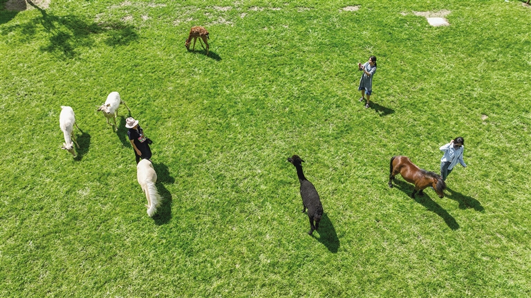 隨著車(chē)輪的滾動(dòng),我們緩緩駛?cè)肓嗣葘檲@,正巧看到了柵欄內(nèi)兩只一棕一白憨態(tài)可掬的羊駝,正在不緊不慢地享受著游客的投喂,身旁一只剛出生的小羊駝依偎在媽媽的懷中。此時(shí),一名小朋友追著好動(dòng)的矮腳馬想要騎兩圈,奈何矮腳馬活潑好動(dòng),小朋友幾番努力下都沒(méi)能如愿,真是可愛(ài)極了。柵欄內(nèi)還有幾只四角綿羊正悠閑地吃著青草,沐浴陽(yáng)光。記者看到,在萌寵樂(lè)園孩子們可以在家長(zhǎng)的陪伴下,近距離接觸這些萌寵,親手喂食、撫摸,感受生命的奇妙與溫暖。