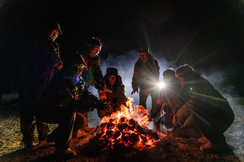 2024年5月10日,野生動物專業(yè)管護隊員在西藏羌塘國家級自然保護區(qū)的宿營地用野牦牛糞烤火取暖。