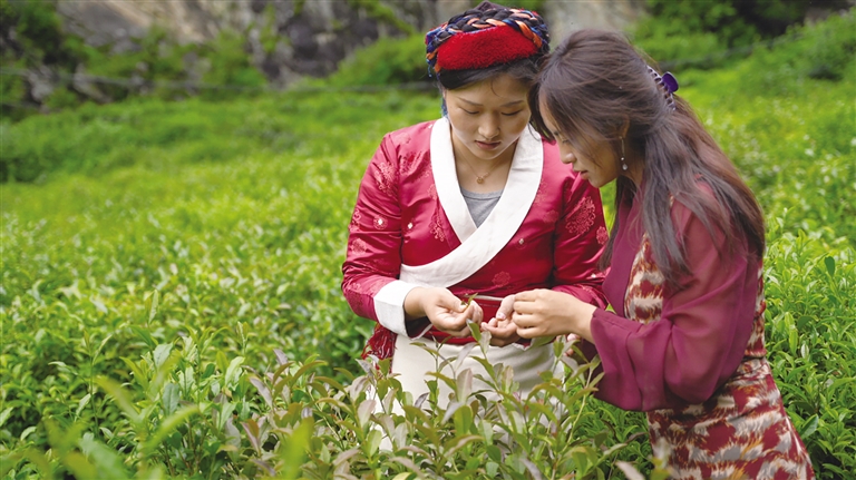 從貢日門巴民族鄉(xiāng)開車去勒門巴民族鄉(xiāng)的路上,沿途的茶園風(fēng)景如畫,尤其是到了采茶季節(jié),整個(gè)茶園洋溢著一片繁忙而和諧的景象。身著門巴族服飾的達(dá)瓦拉珍,腰間輕掛小巧的竹籃,在翠綠的茶樹間穿梭,手指輕盈地跳躍,一片片鮮嫩的綠芽便落入籃中。在她身后是勒門巴民族鄉(xiāng)茶葉農(nóng)牧民專業(yè)合作社茶園,遠(yuǎn)遠(yuǎn)望去茶樹依山傍水,在肥沃的土地上生根發(fā)芽。