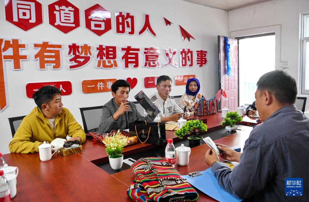 倉秋多吉(左二)和團隊核心成員商討產(chǎn)品銷售提升策略(8月24日攝)。新華社記者 張汝鋒 攝