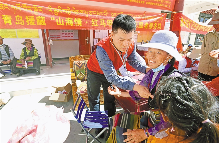 圖為青島援藏組“山海情·紅馬甲”醫(yī)療志愿者服務(wù)隊為日喀則市桑珠孜區(qū)群眾義診。記者 李洲 攝