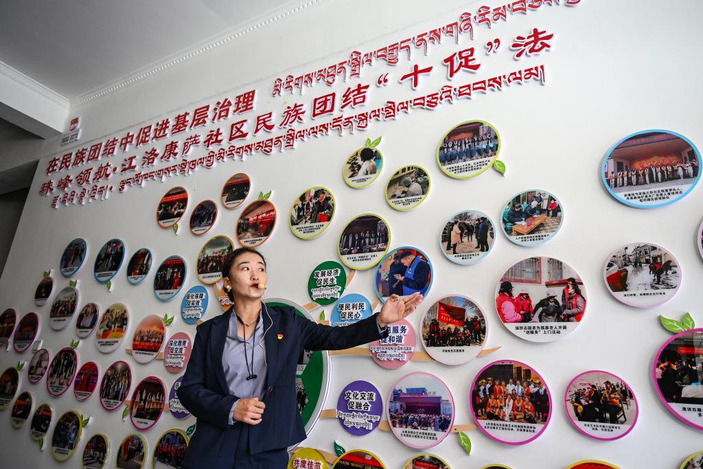 9月2日,江洛康薩社區(qū)黨支部書記次旦央吉介紹社區(qū)情況。新華社記者孫瑞博 攝
