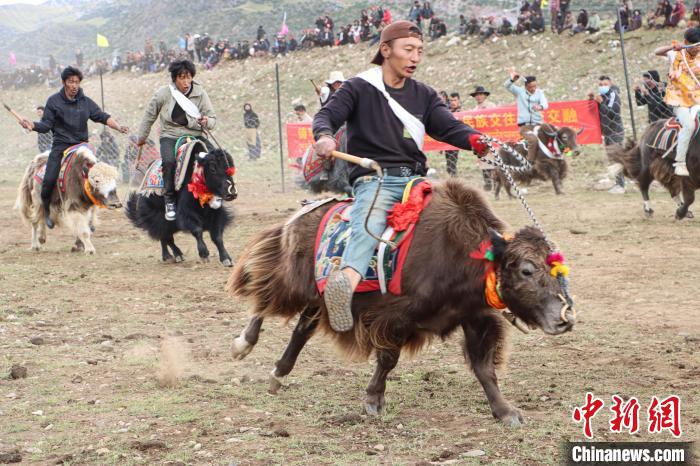 賽牦?;顒蝇F(xiàn)場,牧民將自家的牦牛精心打扮,信心滿滿地走上起跑線,一聲令響,眾騎手驅(qū)牛疾馳?,F(xiàn)場呼聲陣陣,高潮迭起,為每一頭疾馳的牦牛加油歡呼。