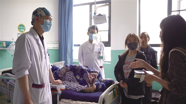 天津市第十批援藏干部、昌都市藏醫(yī)院外科行政副主任陳陽(左一)正在查房。