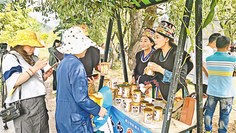 圖為林卡主題音樂會上,工作人員為市民、游客介紹農(nóng)特產(chǎn)品。