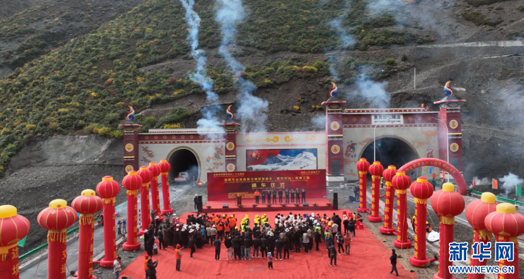 這是夏貢拉山隧道通車(chē)儀式現(xiàn)場(chǎng)(9月29日攝,無(wú)人機(jī)照片)。新華社發(fā)