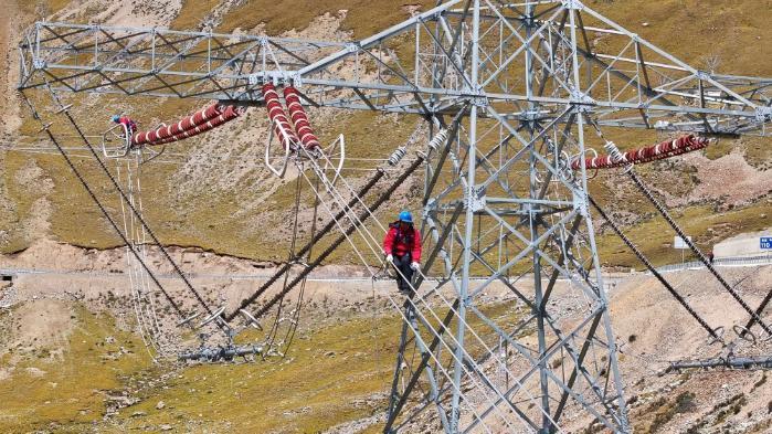 于是在接下來(lái)的幾天,記者跟隨著青藏聯(lián)網(wǎng)工程線路年檢工作人員沿著檢修輸電線路從拉薩市林周縣出發(fā)到那曲市安多縣境內(nèi),在此期間,記者經(jīng)歷了一年四季的天氣變化。9月20日,在青藏聯(lián)網(wǎng)工程西藏側(cè)林周段年檢現(xiàn)場(chǎng)2329號(hào)塔位,2名檢修人員正在40多米的高空檢查絕緣子、金具、導(dǎo)地線、引流板和間隔棒。與此同時(shí),“電力天路”上還有15名國(guó)網(wǎng)西藏電力輸電線路檢修人員同步穿梭在鐵塔與銀線之間,開(kāi)展年度檢修作業(yè)。