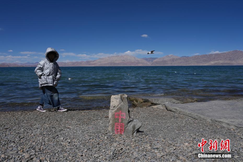 10月4日,一名小游客經(jīng)過班公湖畔的“中國”石碑。“十一”國慶假期,西藏日土縣班公湖吸引不少游客觀光游覽。中新社記者 崔楠 攝