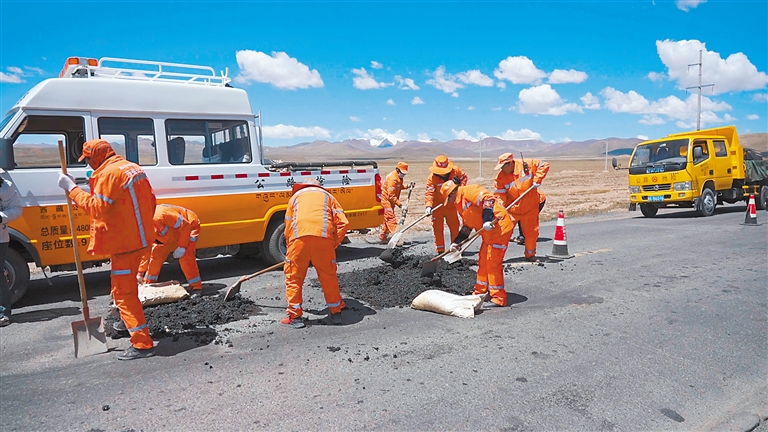 采訪組一行抵達109養(yǎng)護保通點時正值中午,剛好遇到工區(qū)長地嘎帶著職工前往青藏公路作業(yè),填坑鋪油,維護路面,確保車輛正常通行。