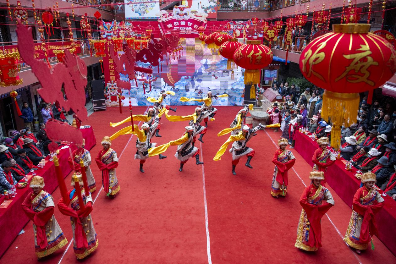 圖為元宵節(jié)期間拉薩市城關區(qū)雪巴拉姆藝術(shù)團的演員在拉薩德賽大院里表演。新華網(wǎng) 旦增努布 攝