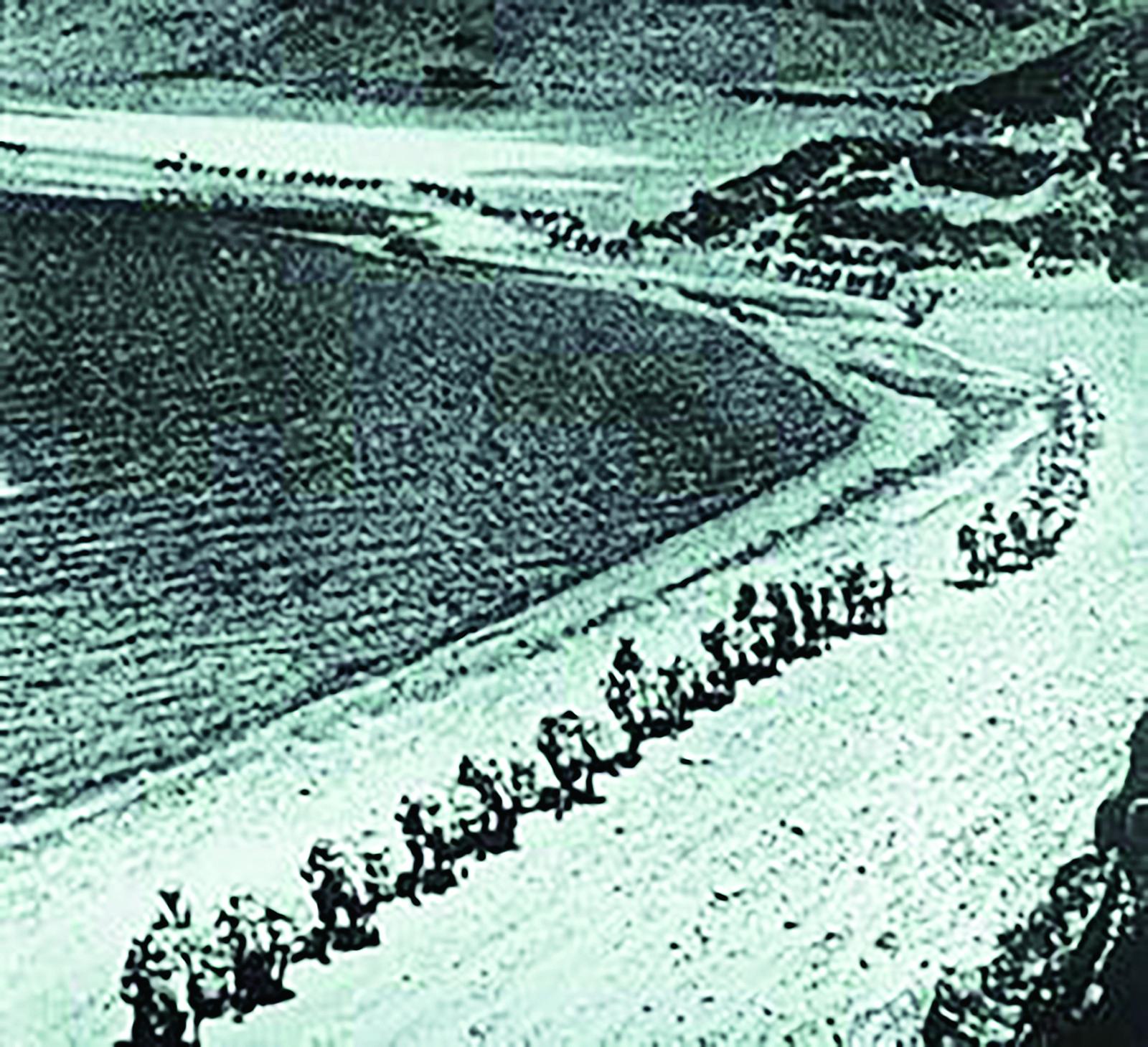 1954年4月,慕生忠宣布,筑路工程隊正式成立。工程隊下設2個測量隊、6個施工隊和1個后勤保障單位。隨后,筑路大軍帶著帳篷,牽著駱駝,用大錘鐵鍬叩響了天路之門。