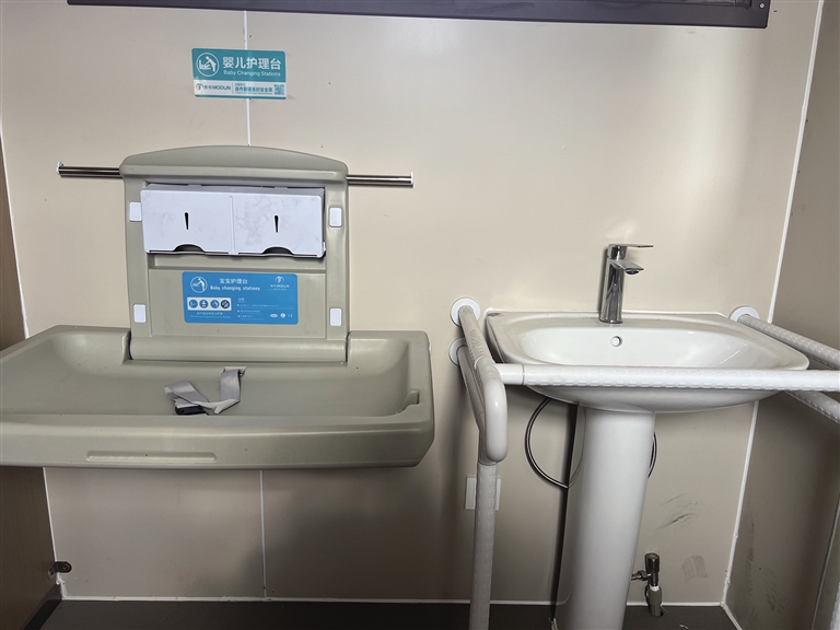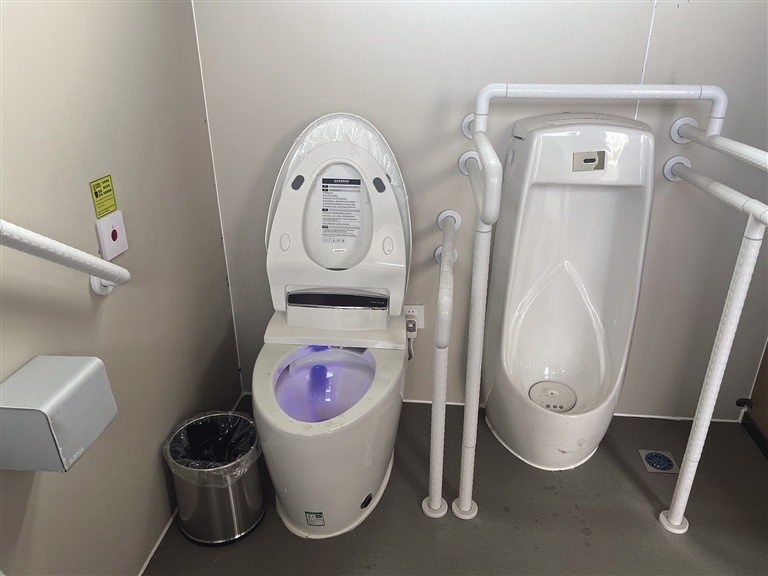 公廁內(nèi)部除了正常的蹲位,還設(shè)有第三衛(wèi)生間。第三衛(wèi)生間內(nèi)配有嬰兒護(hù)理臺(tái)、嬰兒安全座椅等設(shè)施。除此之外,第三衛(wèi)生間還設(shè)有安全扶手、智能馬桶等設(shè)備,方便腿腳不方便的老年人及殘疾人。智能馬桶旁還安裝有緊急報(bào)警器?!叭绻欣先嗽趲?,就可以按一下緊急報(bào)警器。這也是我們考慮到殘疾人、老年人如廁不方便,增設(shè)的人性化設(shè)計(jì)。”赤列說(shuō)。