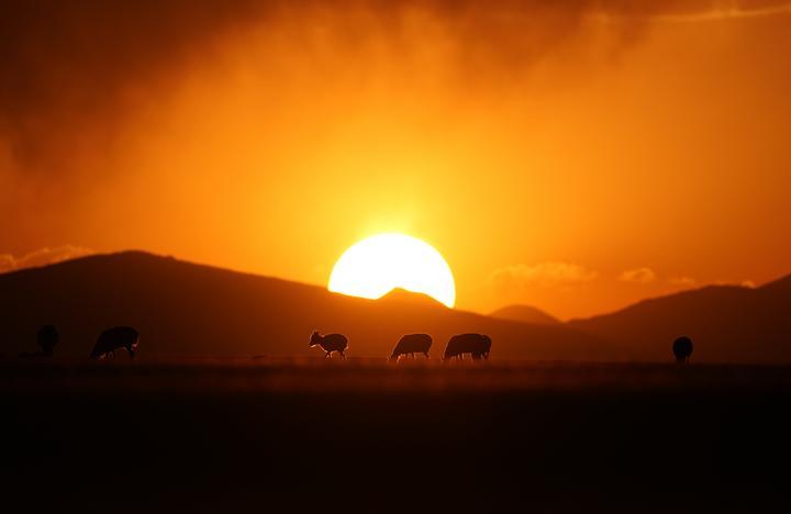 第二天清晨,我來到受傷母羊倒下的地方,它的生命已經(jīng)逝去。此時(shí),一輪紅日正在從它身后升起,不一會(huì)兒,一大群懷孕的母羊從它身邊經(jīng)過,它們走出黑夜,走向朝霞與陽光,步履不停。