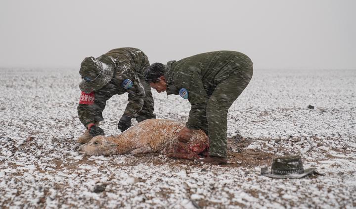 受傷的母羊在漫天風(fēng)雪中蹣跚了200多米后,倒下了。一直在觀望的索朗和羅布來到它身邊,輕輕地?fù)崦纳眢w,口中念念有詞,然后用塑料布在母羊的腦袋旁邊“搭建”了一個(gè)小帳篷,為它擋風(fēng)遮雪,幫它度過最后的時(shí)光。