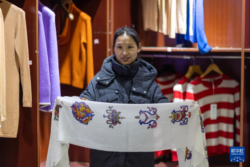措勤縣的銷(xiāo)售人員在展示用紫山羊絨為原料制作的印有八寶圖案的哈達(dá)(11月20日攝)。新華社記者 姜帆 攝