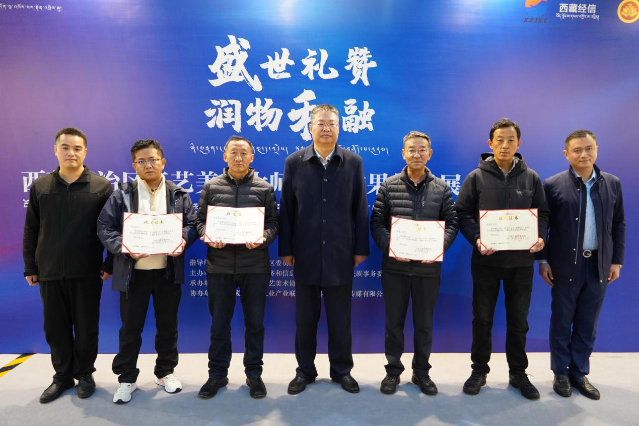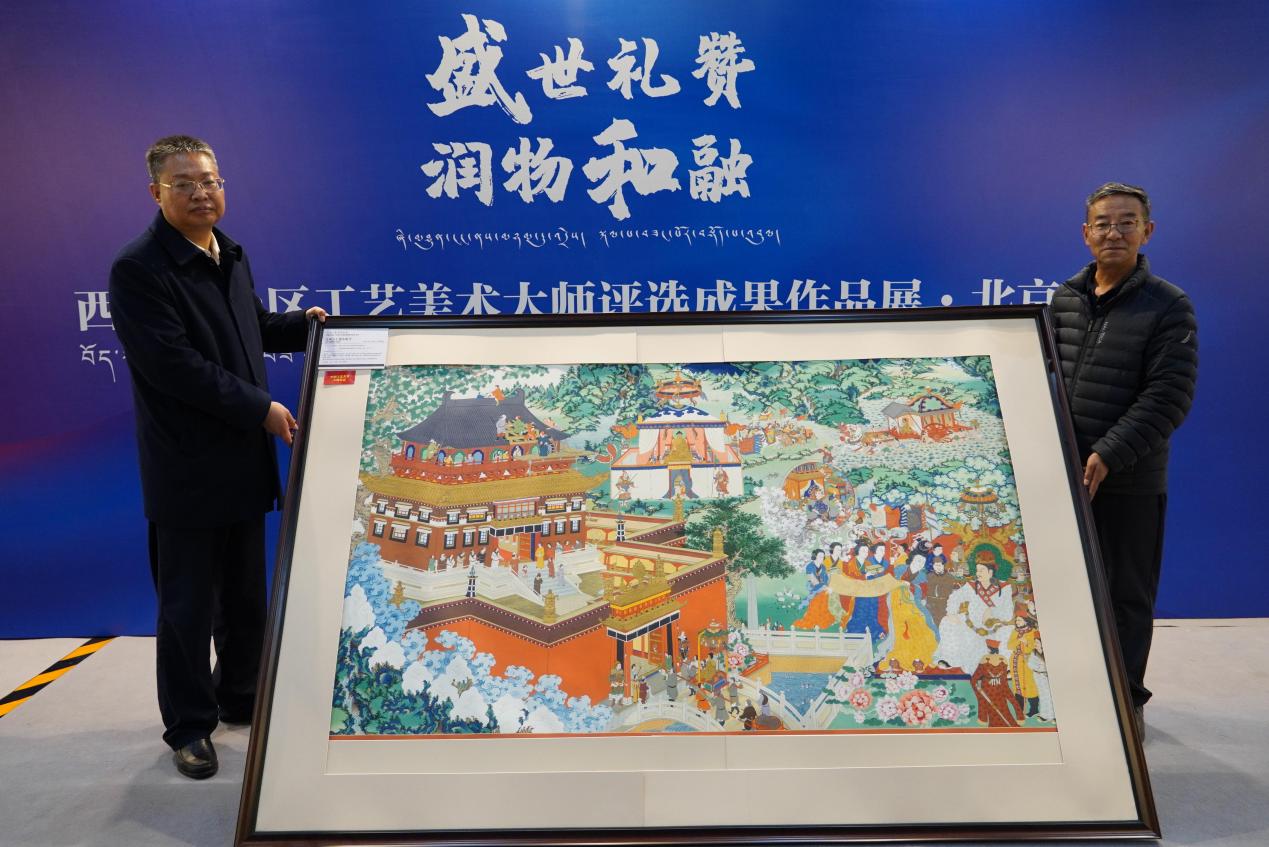 “西藏自治區(qū)工藝美術(shù)大師評(píng)選成果作品展”由西藏自治區(qū)經(jīng)濟(jì)和信息化廳、西藏自治區(qū)民族事務(wù)委員會(huì)聯(lián)合主辦,于2024年11月7日在民族文化宮展出。本次捐贈(zèng)作品為“西藏自治區(qū)工藝美術(shù)大師評(píng)選成果作品展”中的5件代表性精品力作,包括唐卡作品《格薩爾王》(復(fù)制件)(作者:貢覺杰)、《文成公主建小昭寺》(復(fù)制件)(作者:羅布斯達(dá))、《一枝一葉總關(guān)情》(復(fù)制件)(作者:珠木巧),堆繡作品《金絲野牦牛》(作者:晉美洛追)、《石榴籽》(作者:晉美洛追)。任毅同志向作者頒發(fā)了收藏證書,并表示誠摯感謝。