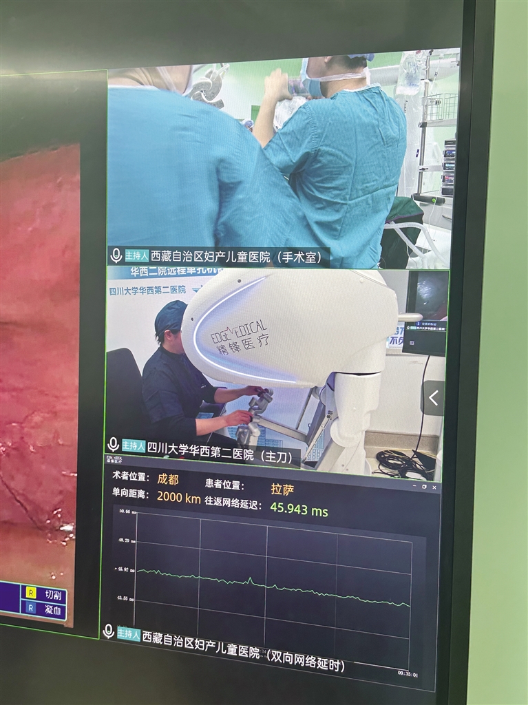 梅玲介紹,此次手術(shù)是與四川大學(xué)華西第二醫(yī)院聯(lián)合開展的,由四川大學(xué)華西第二醫(yī)院的鄭瑩教授團(tuán)隊(duì)主刀,并依托華西的先進(jìn)技術(shù)平臺(tái),通過(guò)遠(yuǎn)程方式完成手術(shù)。手術(shù)結(jié)束后,鄭瑩教授通過(guò)視頻向大家介紹,這場(chǎng)跨越2000公里距離與3000米海拔差異的手術(shù),總共用時(shí)1小時(shí)45分鐘,網(wǎng)絡(luò)延遲僅40毫秒?!按舜问中g(shù)的成功為今后更多優(yōu)質(zhì)資源技術(shù)送達(dá)偏遠(yuǎn)地區(qū)提供了重要參考,也為提高西藏醫(yī)療水平打下了堅(jiān)實(shí)的基礎(chǔ)?!编崿撜f(shuō)。