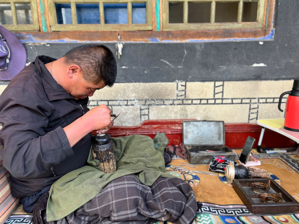 在工布次仁旁邊,另一位古藝大師邊巴扎西正在制作一件銀器。這是一件茶托,湊近看,隱約能看見密密麻麻的小點(diǎn),這是敲擊留下的印記。邊巴扎西把茶托罩在一根豎起的木棍上,繼續(xù)給它塑形。簡(jiǎn)單樸素的制作工具背后,是執(zhí)著的匠心。