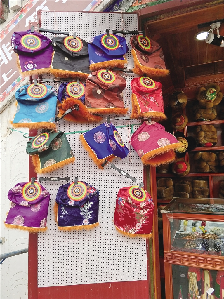 藏式保暖帽的材質(zhì)多為人造毛,有的則是純羊絨,面料多為絲綢,邊沿鑲以絲帶,圖案也不盡相同。帽子的主體呈圓柱形,在后腦勺部位有個(gè)彩色的光圈封頂,能夠很好地蓋住整個(gè)頭部及兩耳。絢麗的顏色,即便是在人頭攢動(dòng)的街頭也很顯眼。