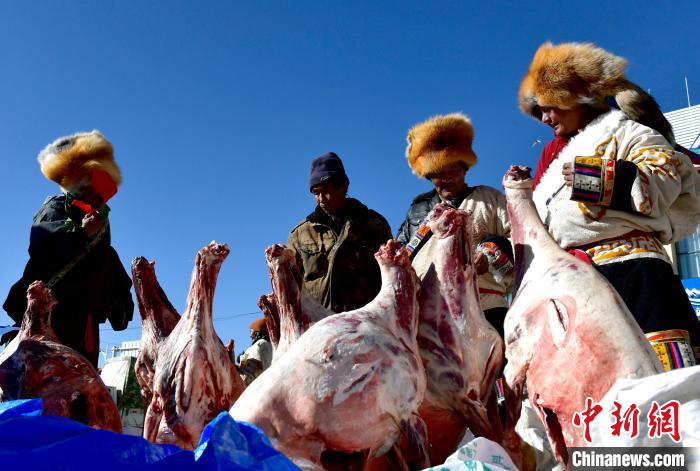 12月6日,西藏自治區(qū)那曲市申扎縣第十八屆畜產(chǎn)品展銷會現(xiàn)場,民眾挑選羊肉?!±盍?攝