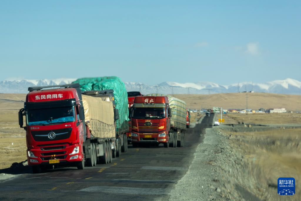 貨車從兩側(cè)遍布熱棒的青藏公路一段經(jīng)過(12月2日攝)。新華社記者 姜帆 攝