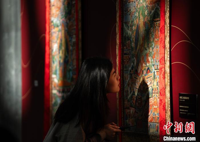 12月9日,“江河匯流 遍弘海內(nèi)”西藏日喀則薩迦唐卡藝術(shù)展在香港西九龍高鐵站紫荊藝術(shù)展演空間揭幕,展覽首次向香港市民游客展示明代《八思巴畫傳》中部分唐卡藝術(shù)品的藝術(shù)微噴摹品,展現(xiàn)日喀則的文化底蘊。當(dāng)天,“珠峰之鄉(xiāng) 情耀香江”日喀則招商引資和文旅推介活動也同步舉行。圖為來賓參觀精美的唐卡摹品。中新網(wǎng)記者 侯宇 攝