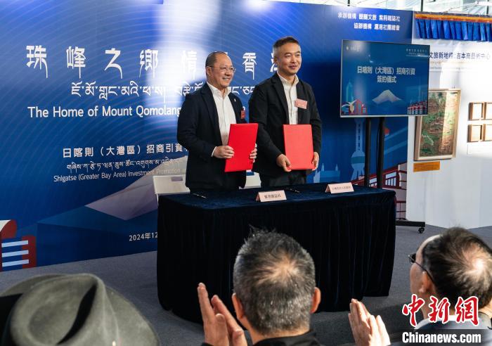圖為日喀則市委副書記、常務(wù)副市長彭一浩(右)和紫荊雜志社總編輯袁建簽署招商引資協(xié)議。中新網(wǎng)記者 侯宇 攝