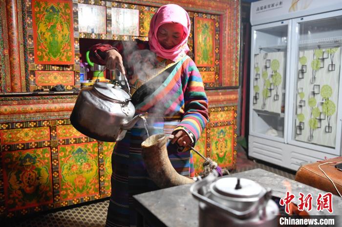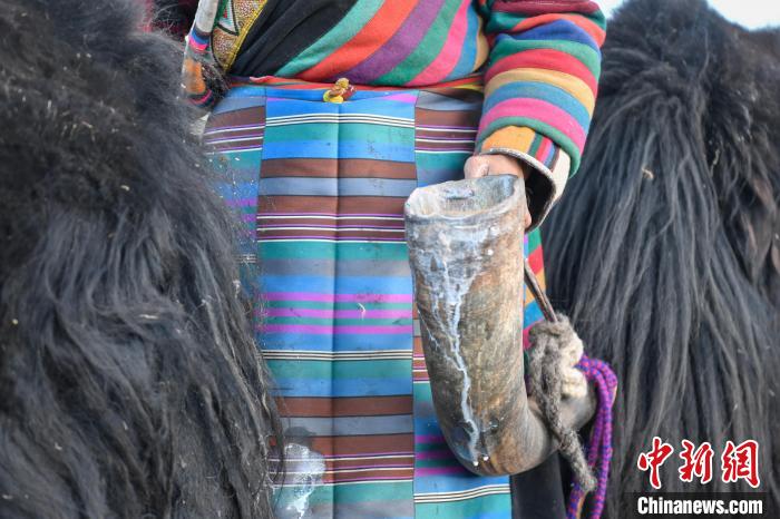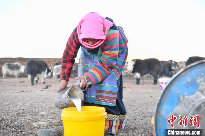 12月12日,西藏自治區(qū)那曲市安多縣帕那鎮(zhèn)牧民土巴卓瑪將擠好的牦牛奶倒入奶桶。中新社記者 貢嘎來(lái)松 攝