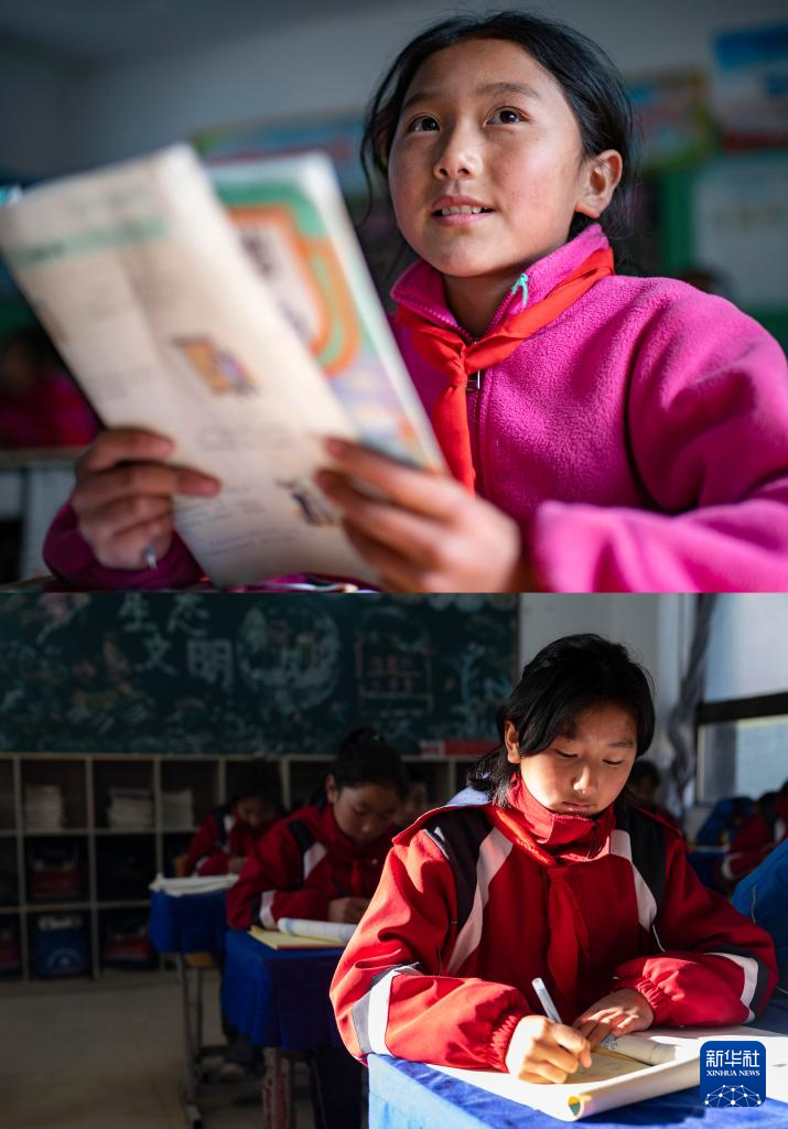 拼版照片:上圖為2021年11月24日,陳塘鎮(zhèn)小學三年級(1)班夏爾巴學生旺姆在讀課文;下圖為2024年12月13日,陳塘鎮(zhèn)小學六年級(1)班夏爾巴學生旺姆在上數(shù)學課。