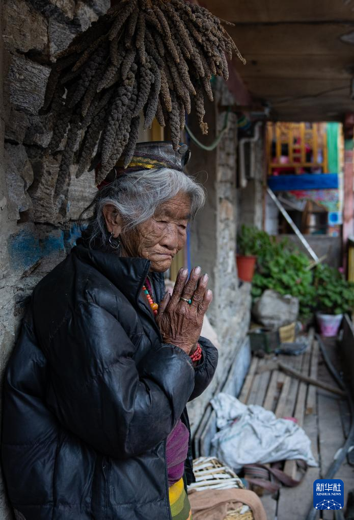 12月13日,一名陳塘鎮(zhèn)夏爾巴老人站在自家陽臺上祈福。
