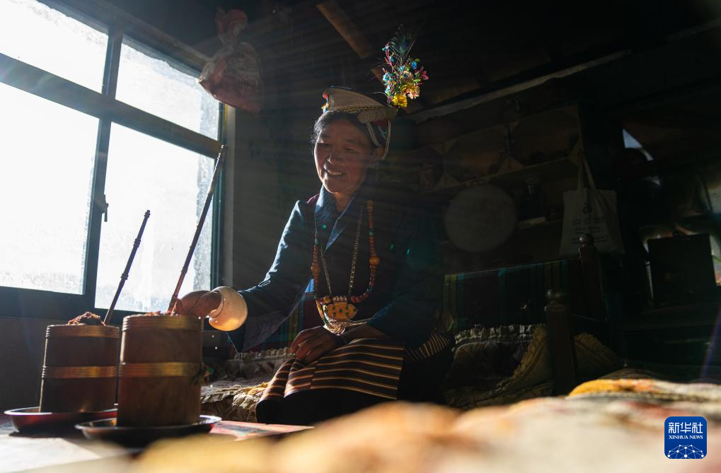 12月13日,陳塘鎮(zhèn)夏爾巴婦女仁增為客人準備飲當?shù)靥禺a(chǎn)雞爪谷酒。